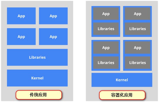 下面这张图能帮助我们更好的理解容器化应用和传统应用的区别: